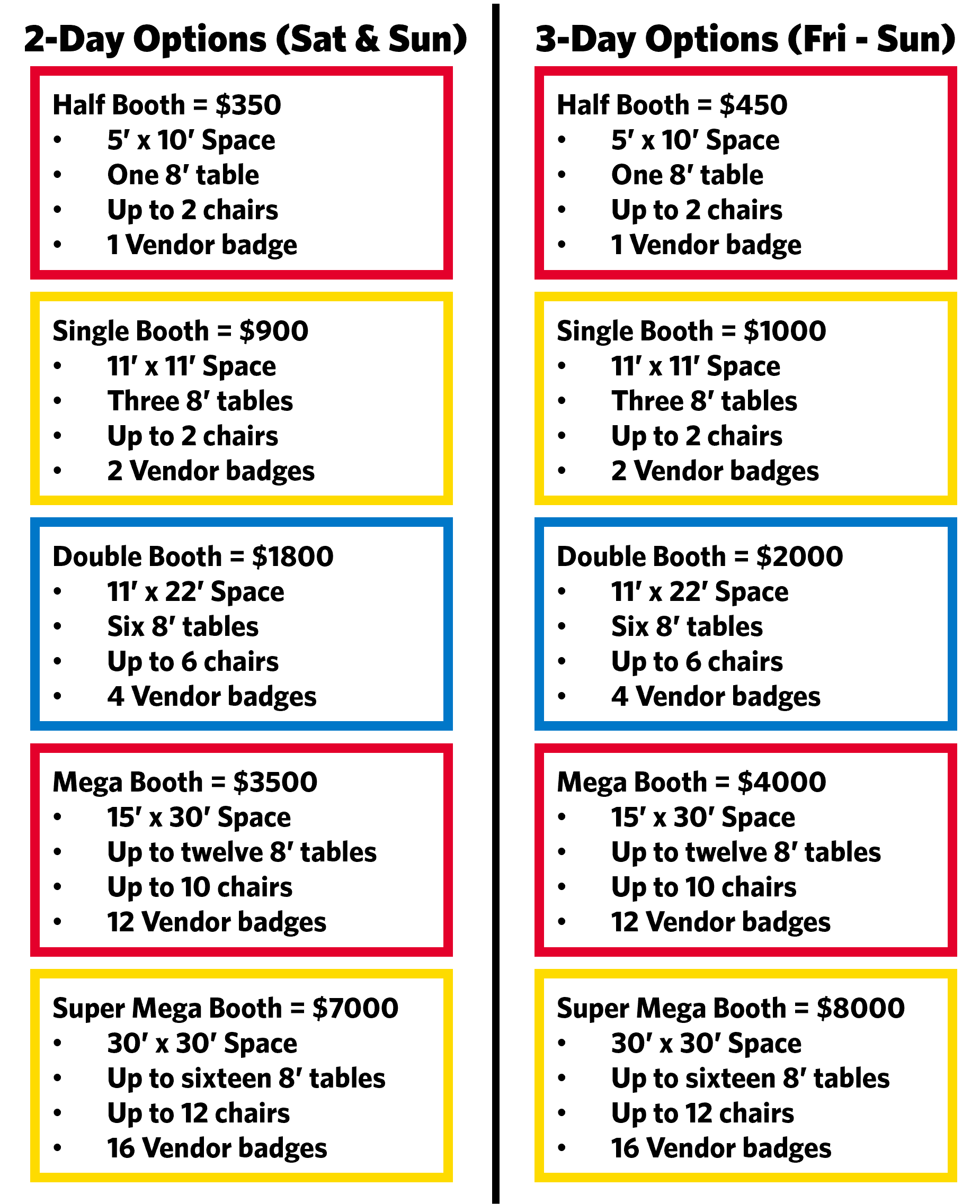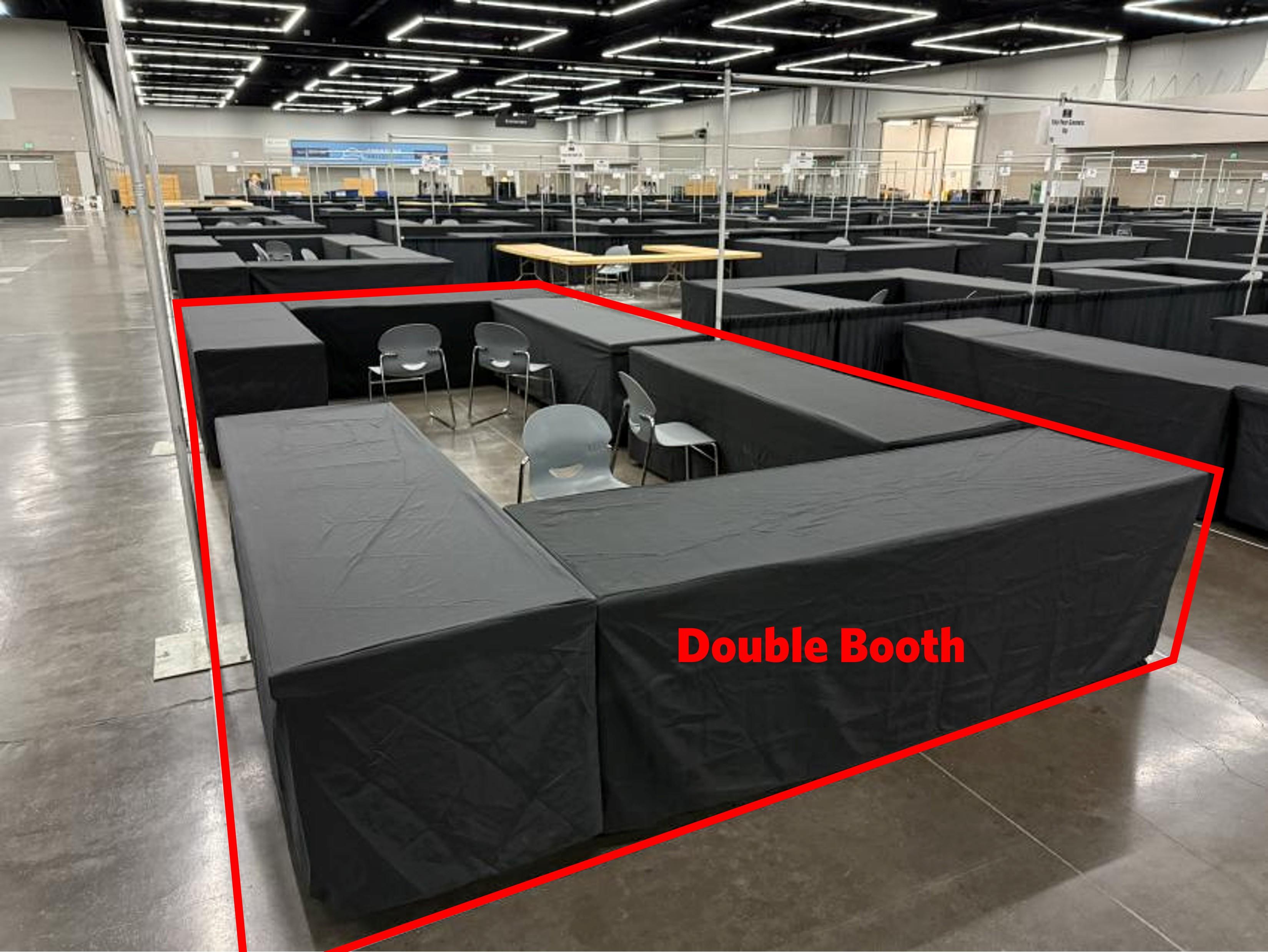 Typical Double Booth with six tables and up to 6 chairs (your choice).