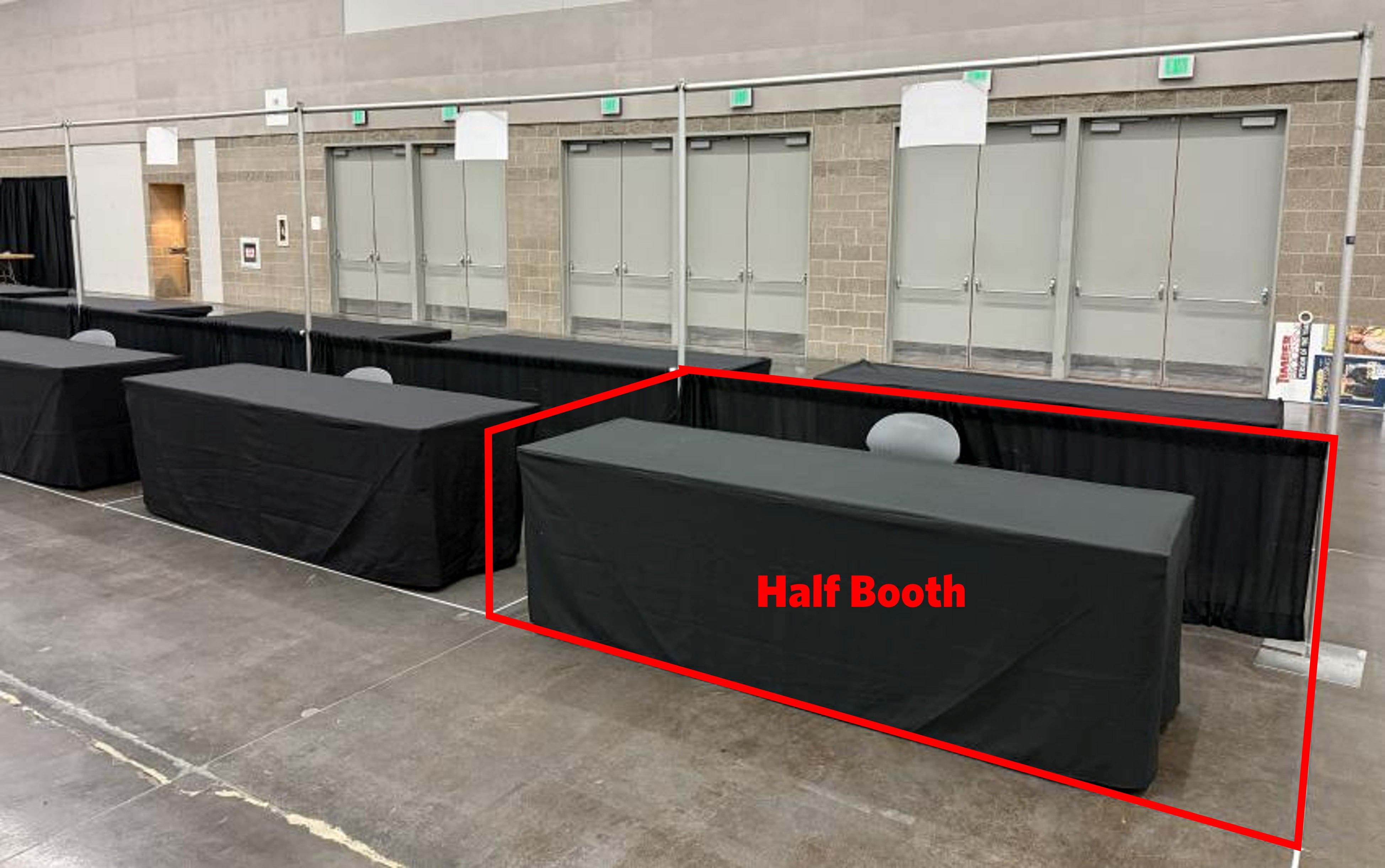 While most trade show booths are only accessible from the front, many of our booths are accessible from at least three sides. We include a generous 4 or more feet of space between adjacent booths to maximize frontage available to attendees. All our exhibitor spaces include tables with tablecloths in the package price. Further, booths that are back-to-back with another row of exhibitors include a half-drape wall and full-height pipe for hanging signage. For stand-alone booths, pipe and stands are available for hanging signage/banners.